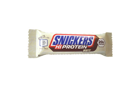 Riegel mit hohem Proteingehalt mit einer Schicht aus Erdnüssen und Karamell, umhüllt von weißer Schokolade.