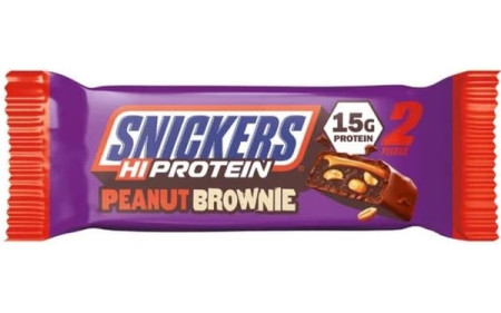 Riegel mit hohem Proteingehalt, mit einer Schicht aus Karamell und einer bissfesten Erdnuss-Brownie-Füllung, mit Milchschokolade überzogen.